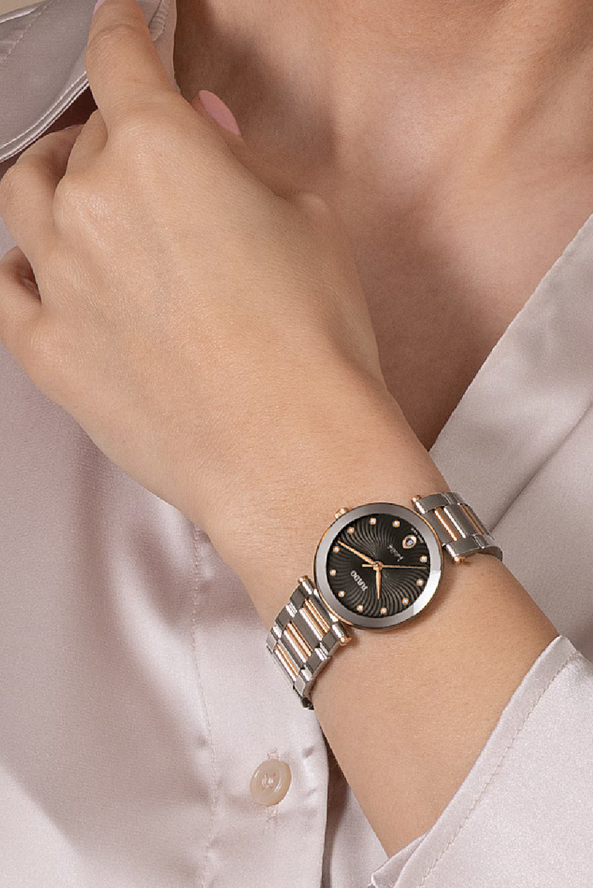 The Balmain Taffetas is a jewellery-inspired women’s watch that blends asymmetric elegance with modern charm. Its stainless steel hexagonal case and matching bracelet reflect the crisp beauty of silk, while the black dial, subtly signed...