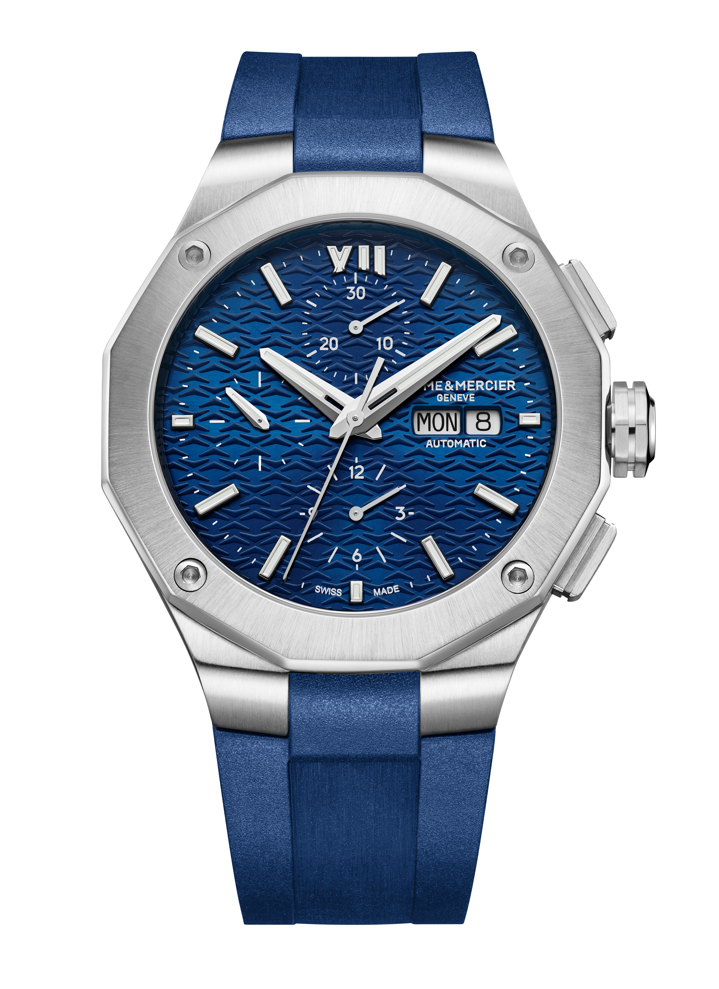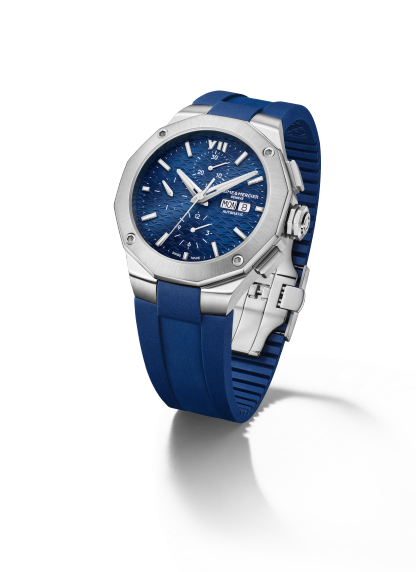 Equipped with Valjoux automatic movement, this Riviera is adorned with a blue sun satin-finished dial and a matching blue rubber strap This timepiece with assertive characters fits perfectly with Maisons' chronographs tradition.