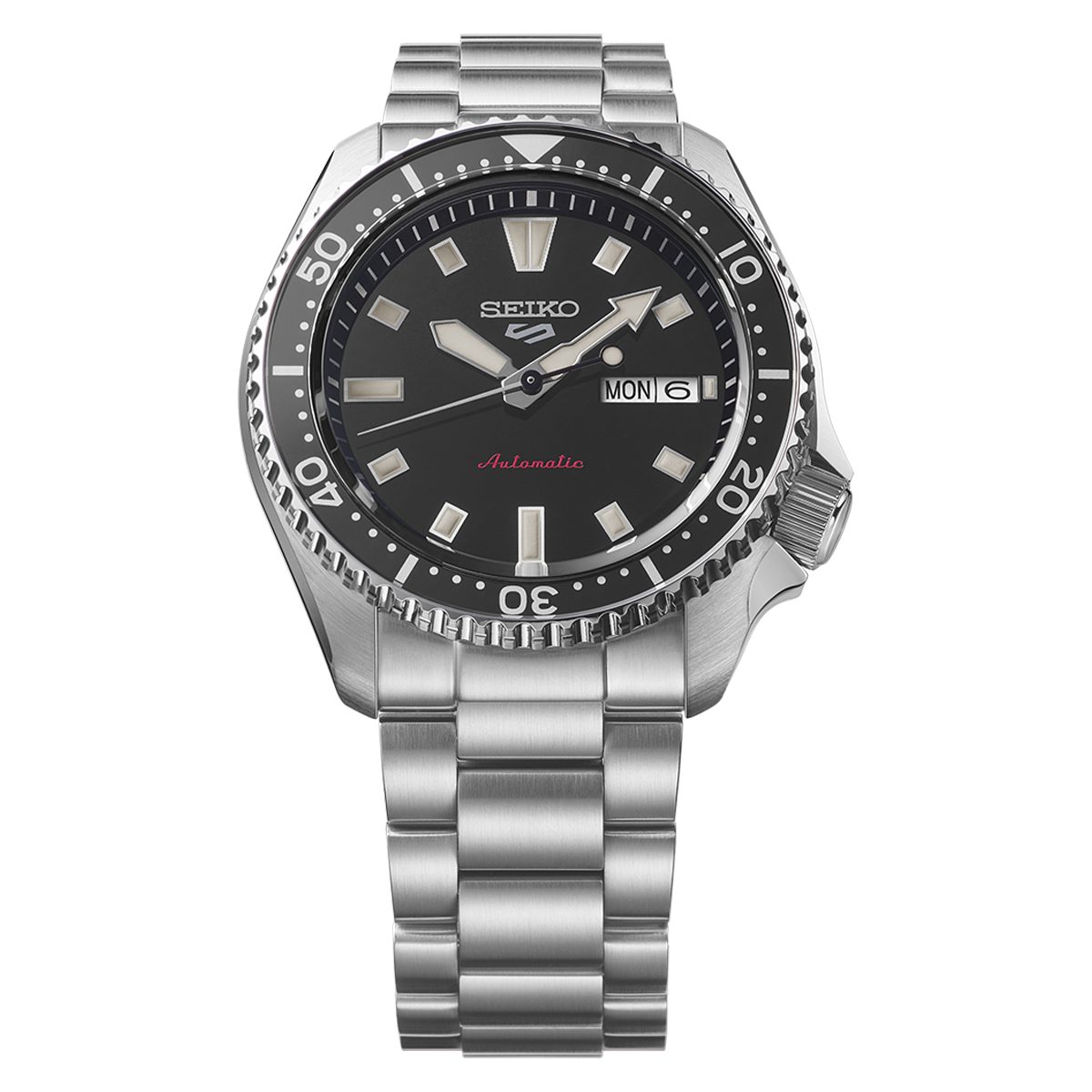 This watch pays homage to the SKX399 – a popular model from the original Seiko 5 Sports SKX series, first introduced in the 1990s. This modern black dial model inherits the layout of the original piece, taking the same richly textured indices and hands, but with updated finishing on the knurling of the bezel and a glossy glass bezel insert for increased sparkle. Powered by the in-house built 4R36 automatic movement, this watch is accurate to +45 / -35 seconds per day, with a 40-hour power reserve. Seiko 5 Sports is known for over fifty years of reliability, durability, performance and value. ‘’5’’ represents the original five key features of every Seiko 5 still present today: Automatic movement, Day-date display, Water Resistance, Recessed crown and Durable case and bracelet.
