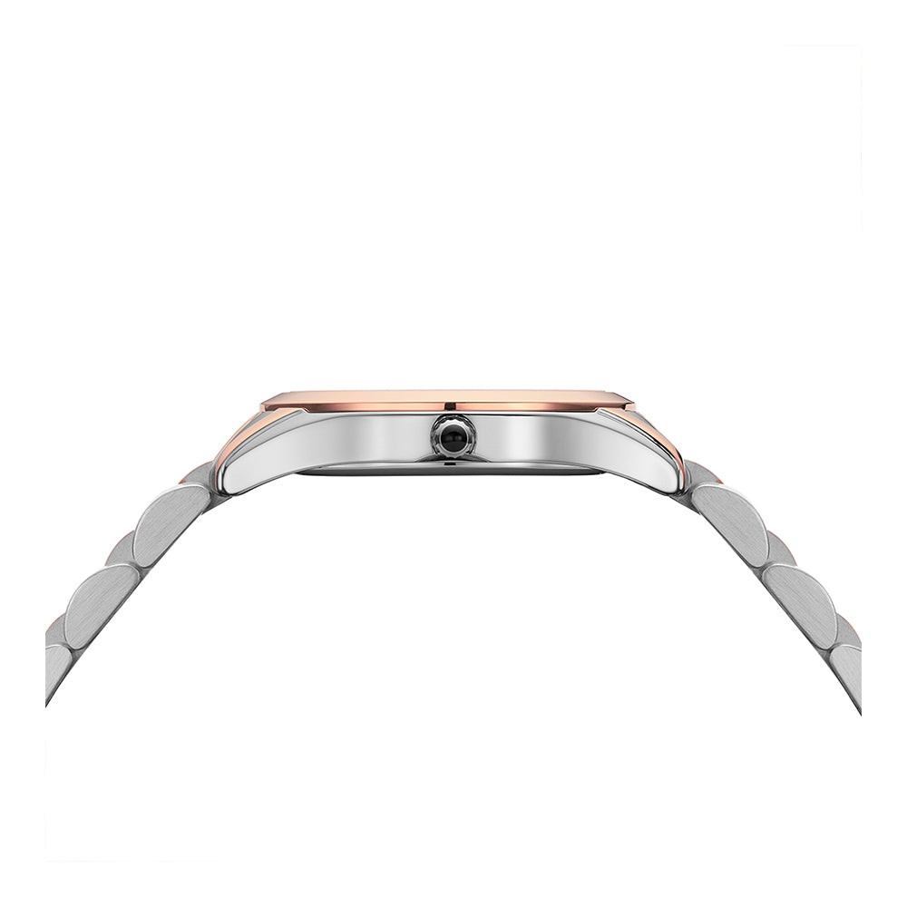 The 30 mm bicolor stainless steel and rose gold PVD case, crafted with a slim 6.50 mm profile, delivers comfort and understated luxury.