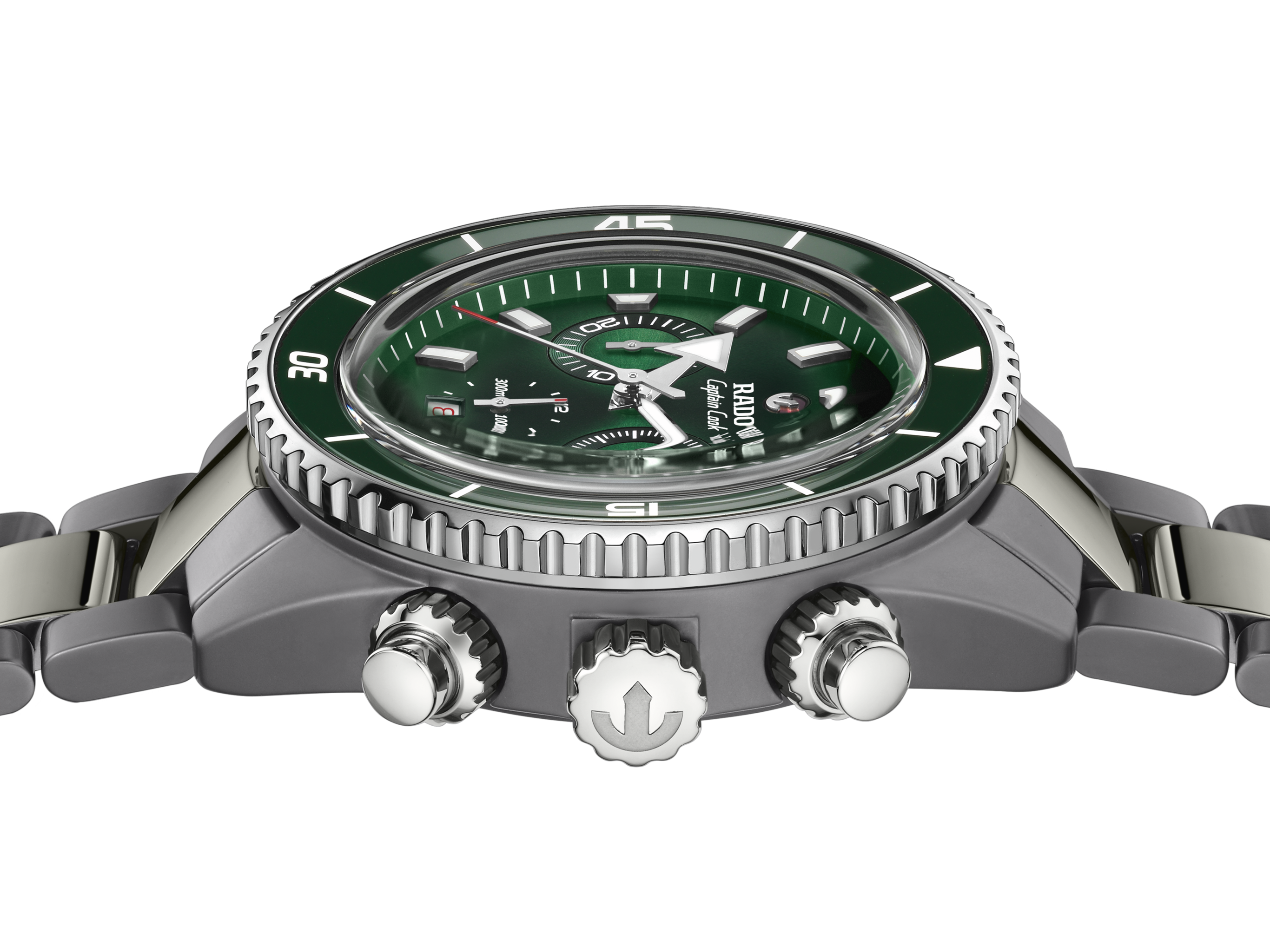 Precision forged through extreme engineering—the Captain Cook High-Tech Ceramic Chronograph is the result of uncompromising processes and material innovation. Born from pressure, heat, and technical mastery, its construction pushes the boundaries of what’s possible in modern watchmaking. The 43 mm monobloc case is crafted from plasma high tech ceramic, the result of an extreme transformation process where white ceramic is exposed to gases activated at 20,000 degrees Celsius. In this searing environment, its molecular structure is altered, giving rise to a unique metallic finish—achieved without a single particle of metal.