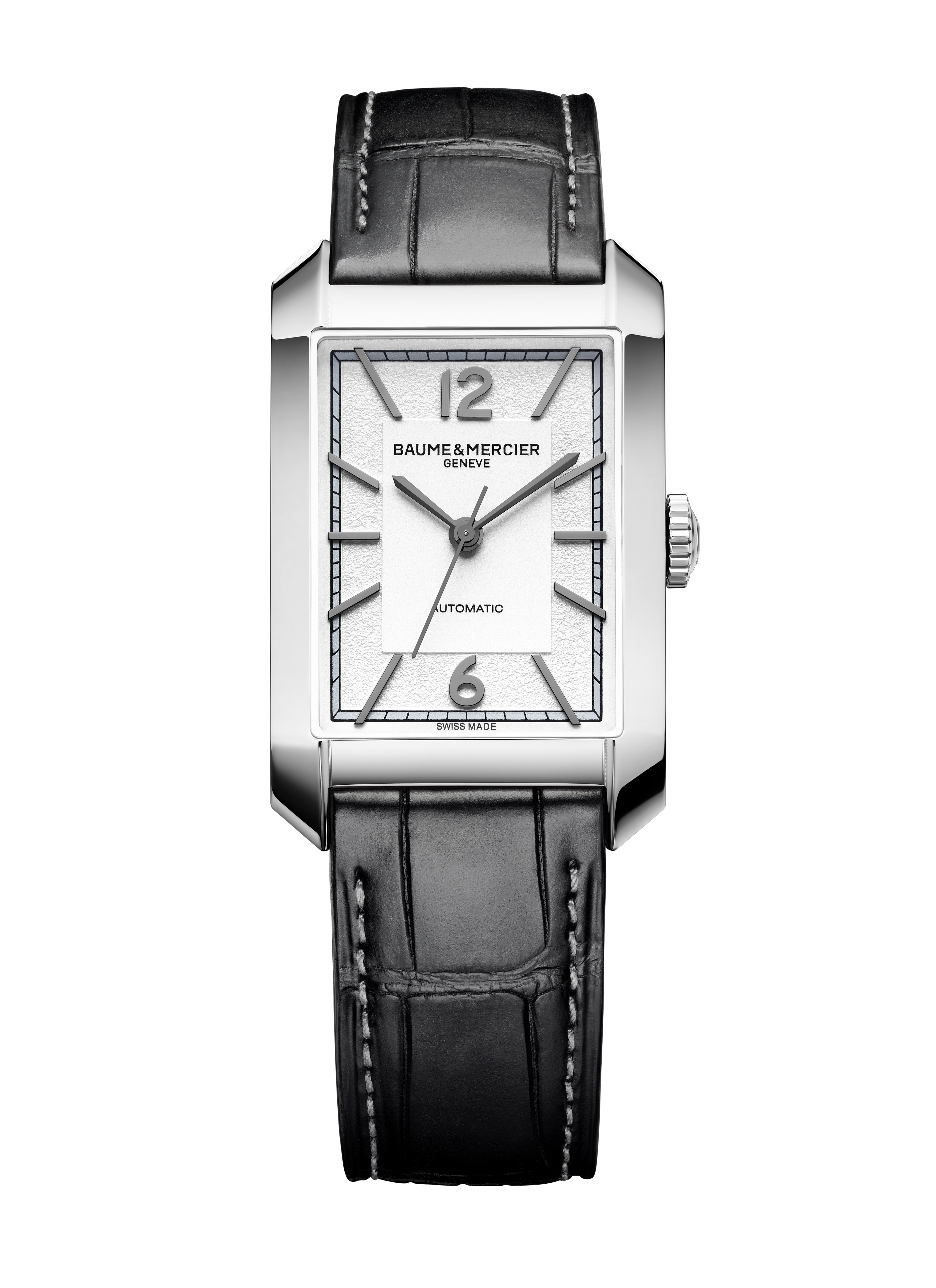 With a black alligator strap detailed, square scales, grey stitching and a polished steel case, this Hampton wristwatch offers a tasteful modern style.