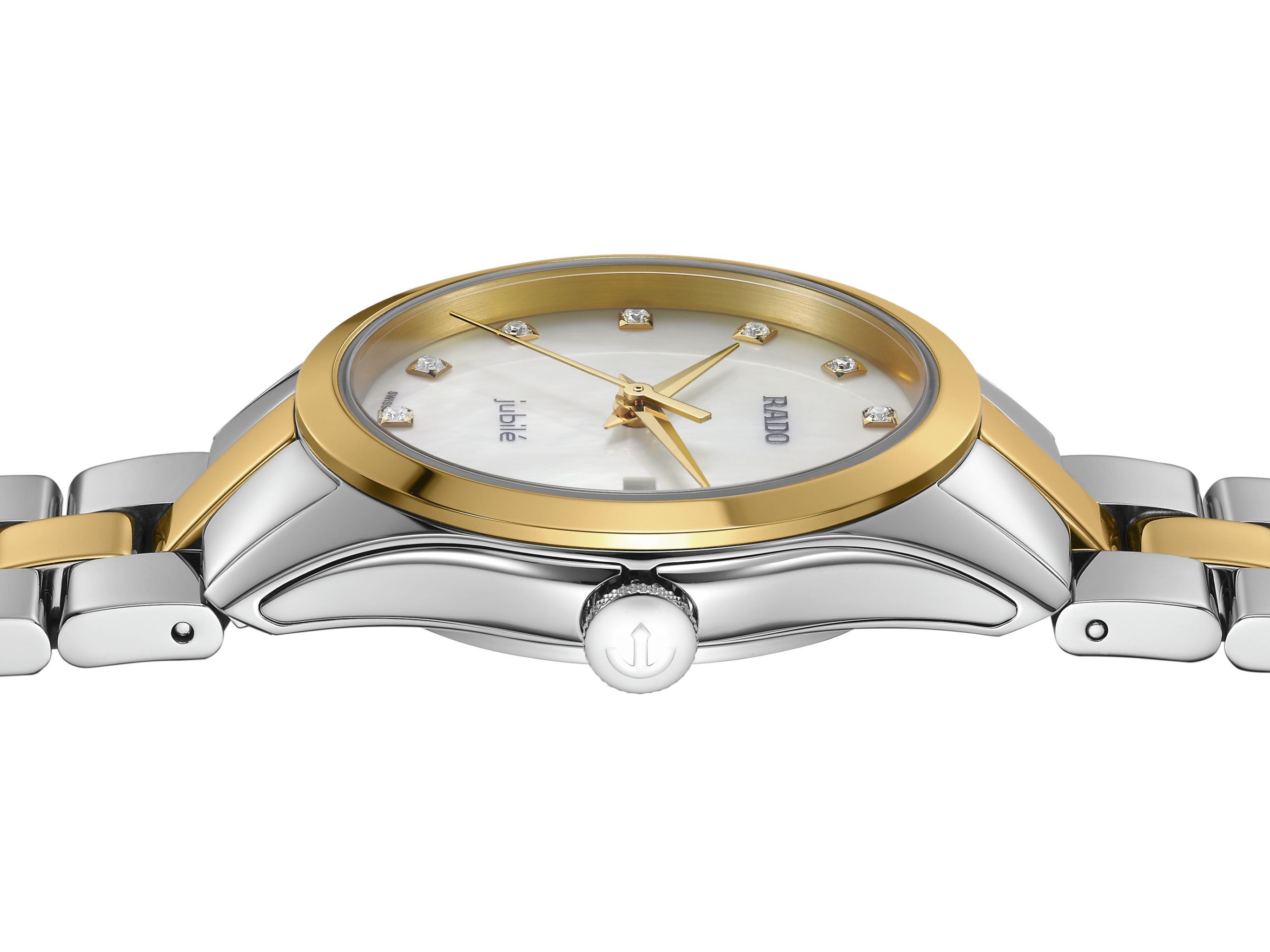 The white mother-of-pearl dial with 12 diamonds is covered by a curved sapphire crystal with anti-reflective coating on both sides.
