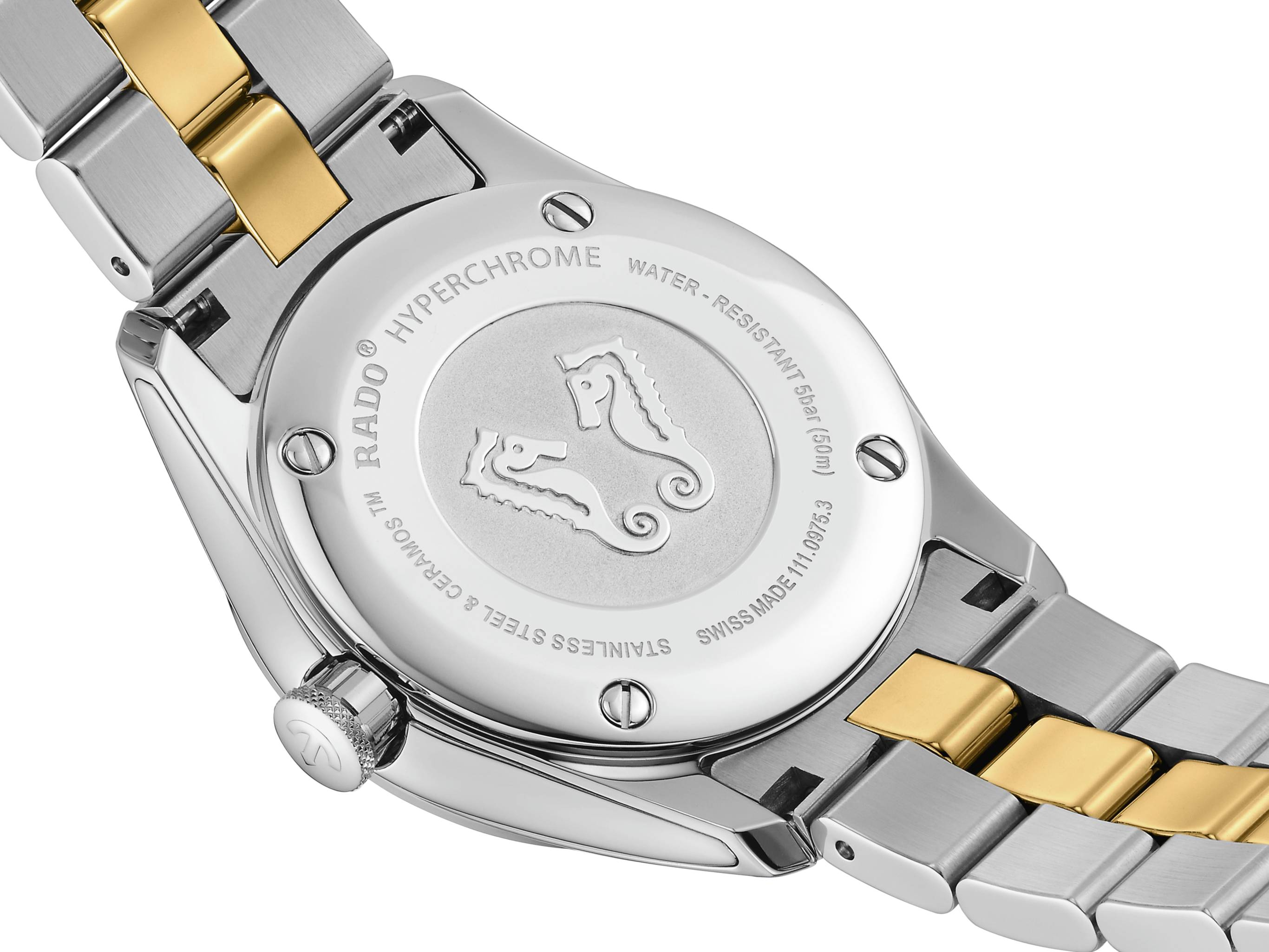 The HyperChrome Quartz features a 30mm polished stainless-steel case and crown and a polished yellow gold coloured Ceramos™ bezel, which matches with the 3-row polished stainless steel bracelet with yellow gold coloured Ceramos™ middle links.