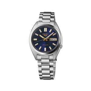 Continuing the evolution of our long-standing Seiko 5 Sports fan favourite SNXS series, this new watch adopts the design principles of the original inspiration. With the preppy dial colourway of the first SNXS watches, this modern interpretation takes the essence of 70s Seiko 5 Sports models and integrates them with modern specifications. The dial features white Lumibrite hands and indices for a crisp modern look, on a blue ‘blazer’ coloured dial. The gold-coloured hands and indices are non-triangular and contrast with the coloured dial for an elegant aesthetic. The gold accents are designed to be easily matched with classic fashion looks such as gold blazer buttons. Seiko 5 Sports is known for over fifty years of reliability, durability, performance, and value. ‘5’ represents the original five key features of every Seiko 5 still present today: Automatic movement, Day-date display, Water Resistance, Recessed crown and Durable case and bracelet.