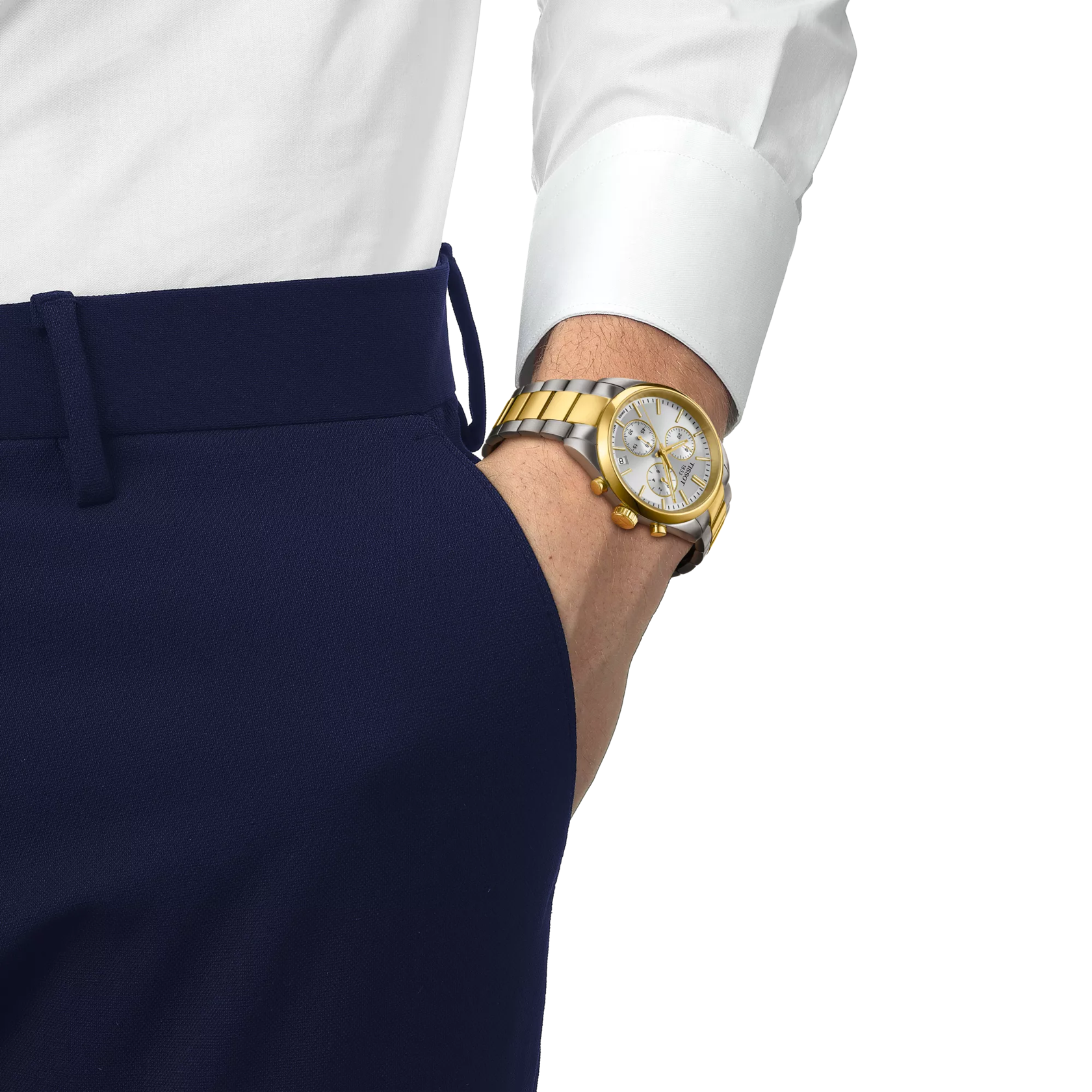 The PR100 collection offers classic quartz chronographs in various colours. These sporty yet classy timepieces feature a polished middle row on the bracelet for a shinier look, a white disc in the date window, and a standard second hand.